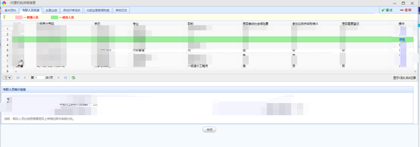 4.按照规定,代理机构专职从业人员应不少于 5 名。此处的“专职从业人员”,指与代理机构签订正式劳动合同、由代理机构依法缴纳社会保险费的人员,不包含财务、行政等非业务岗位人员,也不包含退休、外聘、兼职人员。请代理机构核对专职人员参保人数与备案人数,确保符合要求。